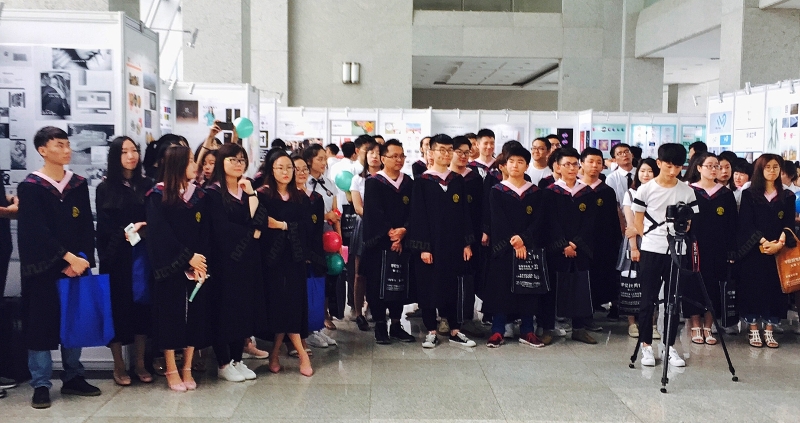 6月3日上午,人文社科系2017届广告学专业毕业设计展开幕。本届展览主题是“如试,如是——手先于心,心手合一”,共展出了94名毕业生精心设计的百余幅作品,吸引了广大师生纷纷到场参观。当天上午,中国地震局局长郑国光、副局长牛之俊在学院领导陪同下前来观展,郑国光饶有兴致地参观了学生作品,并与专业教师进行交流。