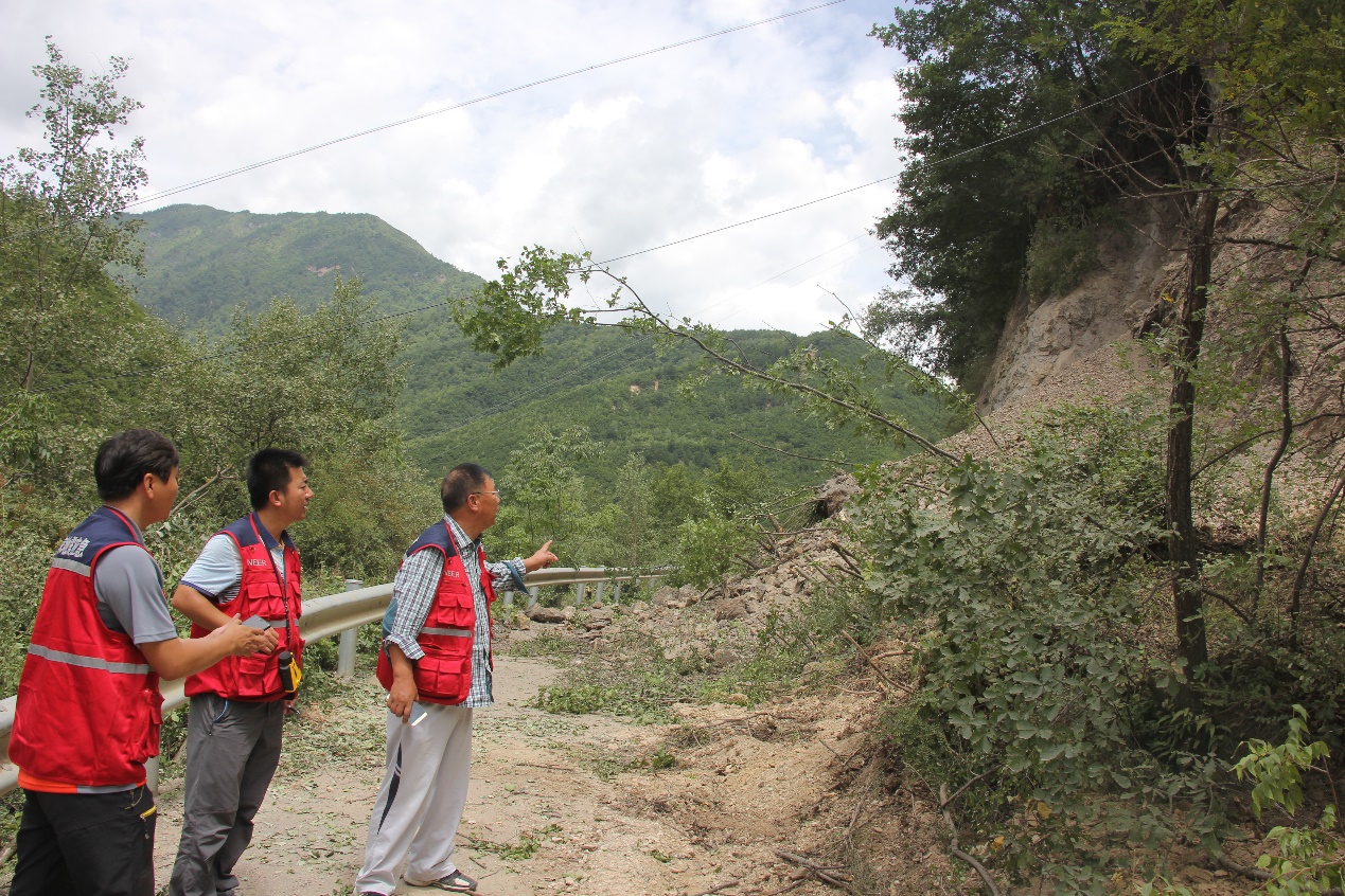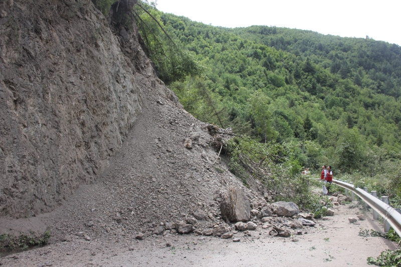 漳扎镇位于九寨沟县西北部,距县城46km,是此次九寨沟7.0级地震震中所在地,也是经济损失和人员伤亡最为严重的地区。此外,由于漳扎镇地处狭长山谷地带,在余震和局地降雨的情况下,山体崩塌滑坡频发。学院工作组在考察途中,恰遇山体滑坡,原被抢通的道路再次受阻。