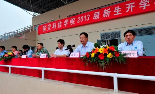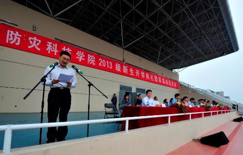 9月9日上午9:00,防灾科技学院2013级新生开学典礼暨军训动员大会在体育场隆重举行。学院领导班子全体成员、南京炮兵学院廊坊校区政治处副主任于飞、学院新生工作领导小组成员、军训工作领导小组成员出席典礼。全体军训教官、指导员和2013级新生参加典礼。大会由学院办公室主任李军主持。