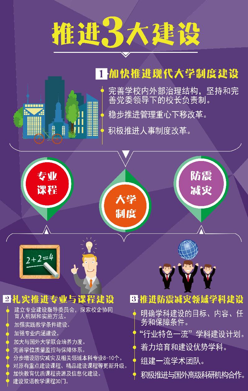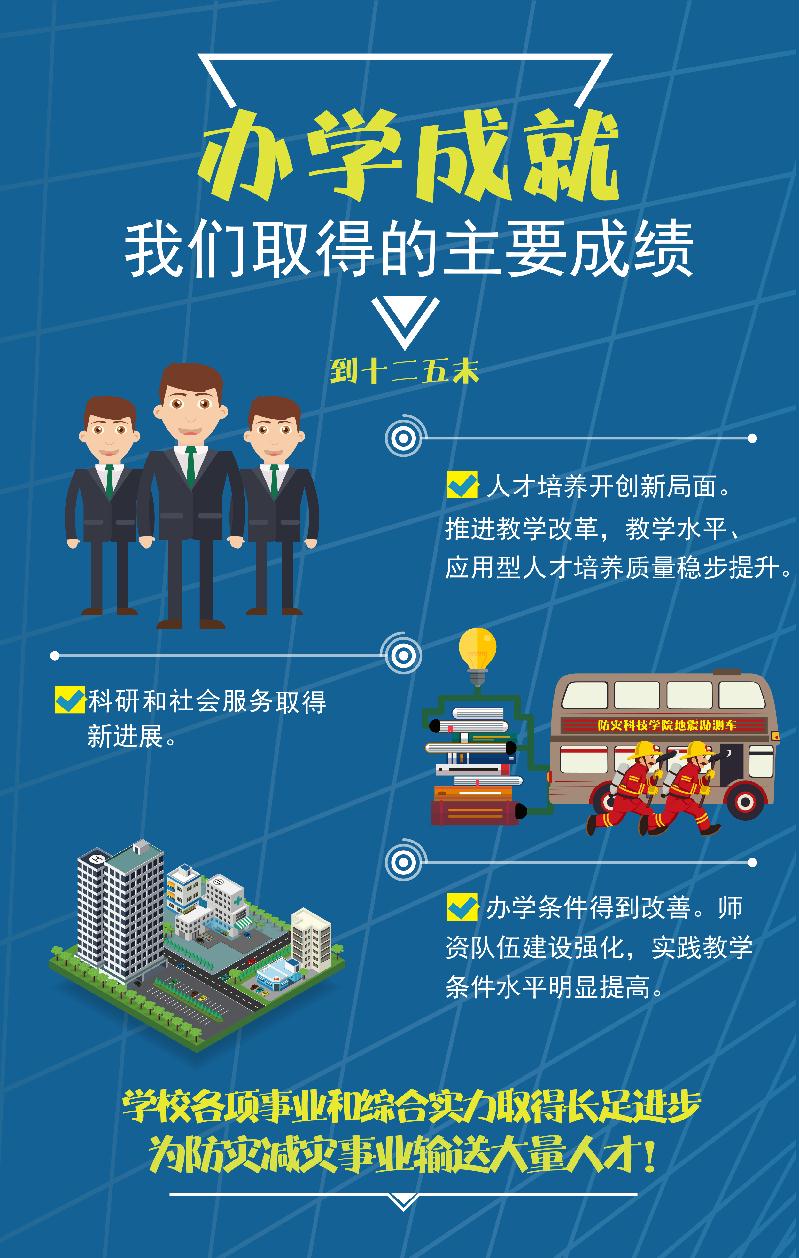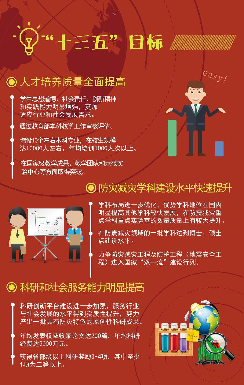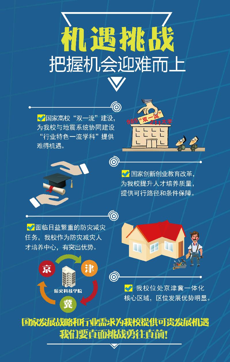 “十三五”时期是我校实现“二次创业,分三步走”发展战略中第二步“全面建成特色鲜明、国内知名、高质量应用型本科院校”的开局期,是进一步提升学院核心竞争力的重要机遇期。为明确发展思路、目标和重点,增强发展的科学性、前瞻性与战略性,根据《国家中长期教育改革和发展规划纲要(2010-2020年)》、《国家防震减灾规划(2006-2020)》和《国务院办公厅关于深化高等学校创新创业教育改革的实施意见》、《统筹推进世界一流大学和一流学科建设总体方案》等文件精神,结合国家防震减灾事业和经济社会发展需要,学院编制了《防灾科技学院“十三五”发展规划》。