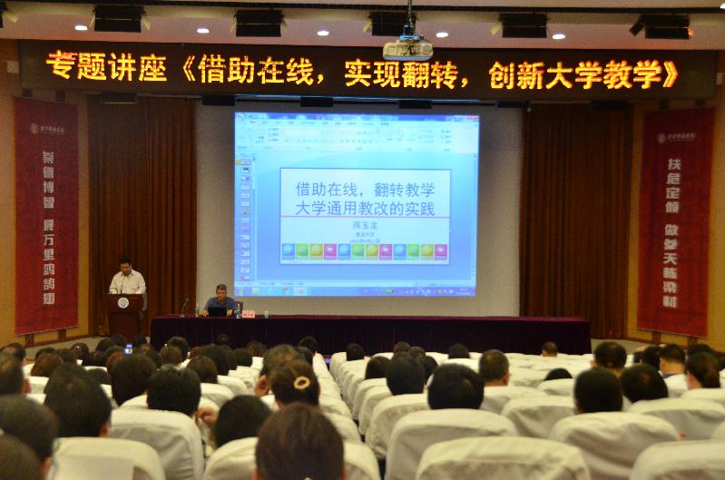 蒋玉龙教授以“借助在线,翻转教学,大学通用教改的实现”为题,针对当前大学生对自身能力和素质的新要求、高校目前课程教学的实际,深入分析了传统教学模式存在的弊端和局限性,指出要借助在线课程实现课堂教学翻转,以改变传统的课堂教学模式,从而提高课程教学效果。