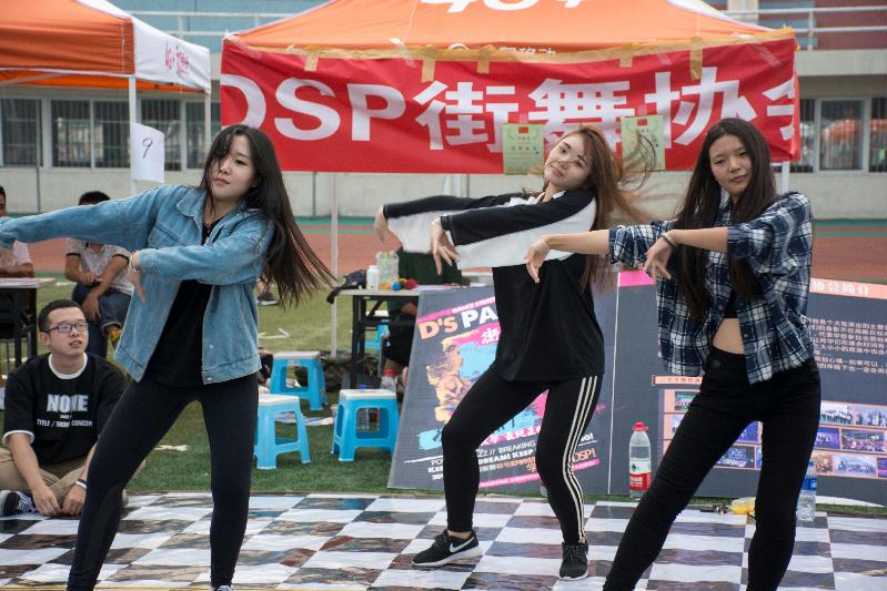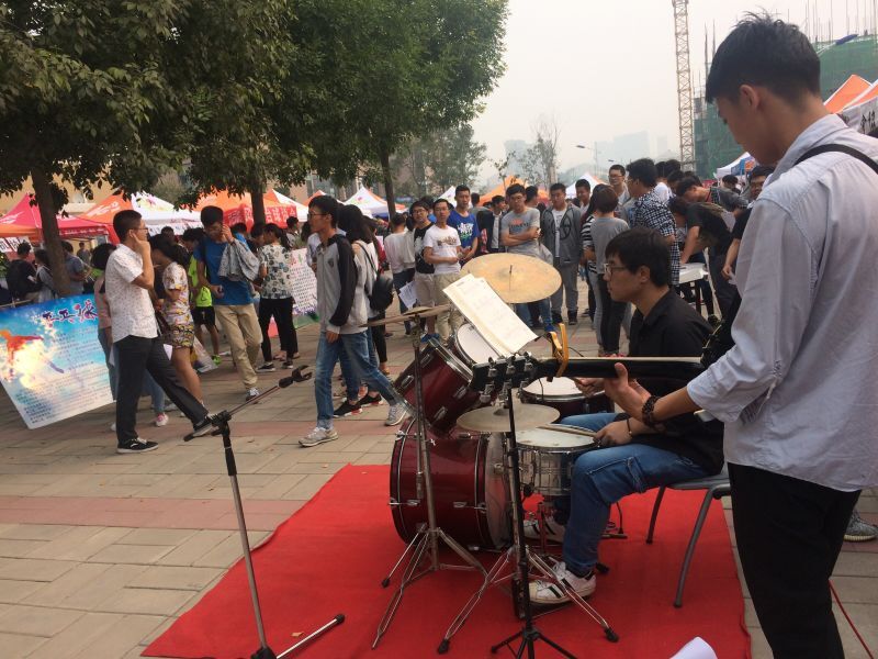 招新现场,音响、桌子、展板、伞棚一应俱全。社团的老社员们热情地用各种方式向2016级新同学宣传讲解着自己的社团。每个社团都将自己的看家本领发挥到极致,以吸引新同学的加入。吉他协会的同学们用激昂的歌声活跃了整个活动场地的气氛;穿梭在人群中身着飘逸汉服的汉服社女子以含蓄的笑容、优雅的动作向新同学介绍他们的社团,并递上小巧的宣传卡;音乐广场拐角处的草坪上铺着红毯,一群洋溢着青春活力的街舞协会队员在动感的音乐中舞动全场;动漫协会会员身着cos服装向新同学展示着二次元的精彩……