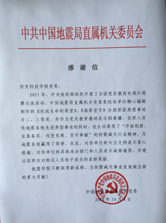 近日获悉,受中国地震局直属机关党委委托,由防灾科技学院党委主办、党委宣传部策划制作的《托起生命的希望》、《高原坚守》两部典型事迹片,在2015年中央组织部开展的全国党员教育电视片观摩交流活动中分别荣获二等奖、三等奖。