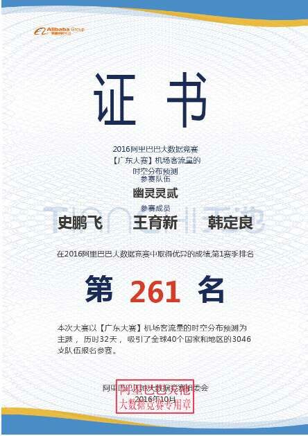 9月21日—10月23日,由我院灾害信息工程系王茂发老师指导、学生史鹏飞(研究生)、陈蕾、宋敏娟、韩定良、王育新、张一博(吉林大学研究生)组成的两支队伍在2016阿里天池大数据竞赛(广东机场数据实时预测赛事)中突破重围,在40个国家近3046支队伍中取得优异成绩,初赛最终排名分别为235及261名,是我院参加该项国际竞赛以来取得的最好成绩,提高了我院的知名度,与第一名的算法实测误差在0.1%范围内。