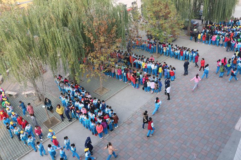 疏散开始前,我院学生向小学生讲解火灾逃生的基本常识,让他们明白火灾如何逃生,使小学生们树立起以“自身安全”为主的自我保护意识。演练中,学生们根据广播发出的指令,按照预定路线分楼层、楼梯、教室前后门有条不紊地撤离到操场,并迅速在预定位置整队集合、清点人数。紧急疏散分两次进行,各年级学生基本上都能在预定时间内到达集结地点,符合安全疏散演练要求。