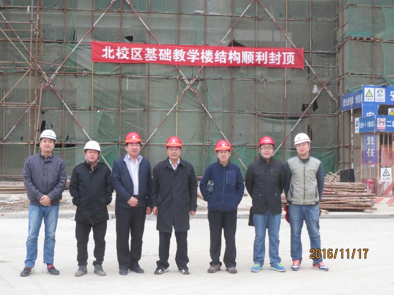 11月15日上午,冬日的暖阳一扫连日雾霾,天空澄碧,纤云不染。10点08分,在学院、监理单位、施工单位、全过程跟踪审计单位等各方工作人员的共同见证下,随着教学楼八层最后一方混凝土浇筑到位,我院北校区基础教学楼主体结构顺利封顶,标志着该项目完成阶段性建设成果。