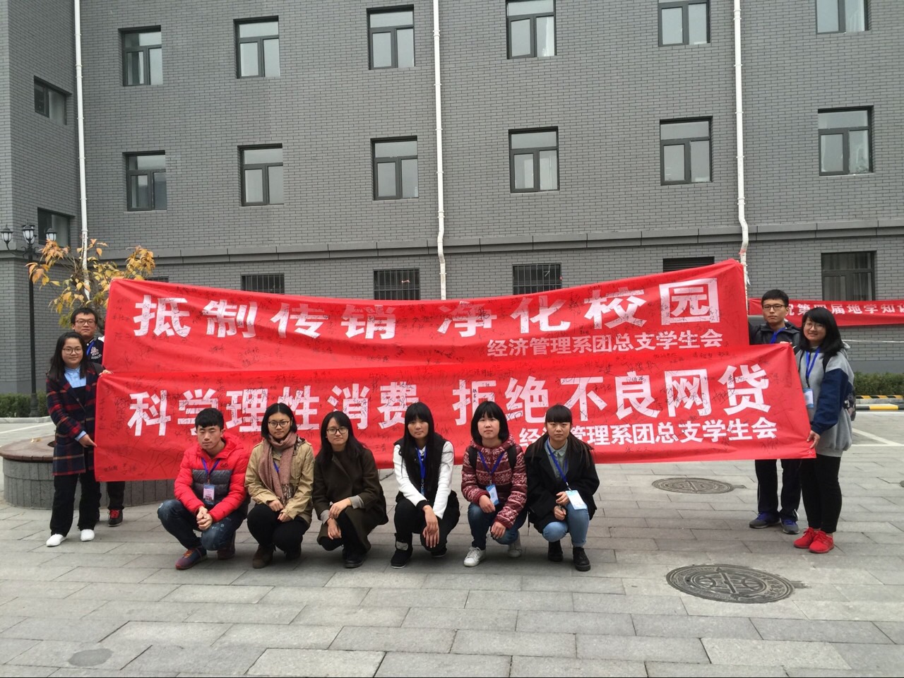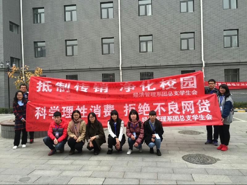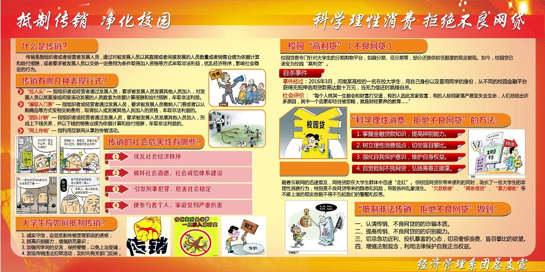 经济管理系“抵制不良网贷、传销,共建平安校园”主题宣教活动从11月8日开始,载体丰富、形式多样,充分利用传统宣传方式和现代信息手段相结合,多层次、多角度、多渠道的宣传,充分揭露不良网贷和传销的违法性、欺骗性、隐蔽性和危害性。从线上官方微信平台专题网络宣传,到线下宿舍楼、教学楼宣传栏里的海报和展板;从各班开展重点筛查和主题班会,到学生会组织条幅签名承诺;从各个班级QQ群重点案例扩散,到学生电子创演作品比赛,表达了经济管理系师生抵制不良网贷、传销的决心,为在全院形成净化校园、抵制传销,理性消费、拒绝不良网贷的良好氛围做出了最大的努力。