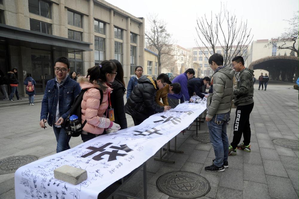 中午11时30分,团委组宣部的同学在南校思源餐厅门前举行条幅签名活动,同学们纷纷在“勿忘国耻、振兴中华”的条幅上签名,表达热爱祖国、珍惜和平、保卫家园的决心。