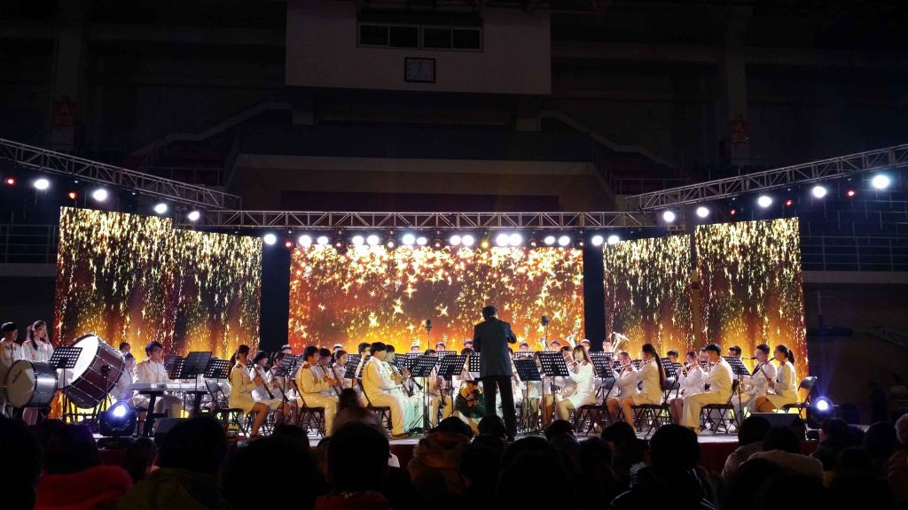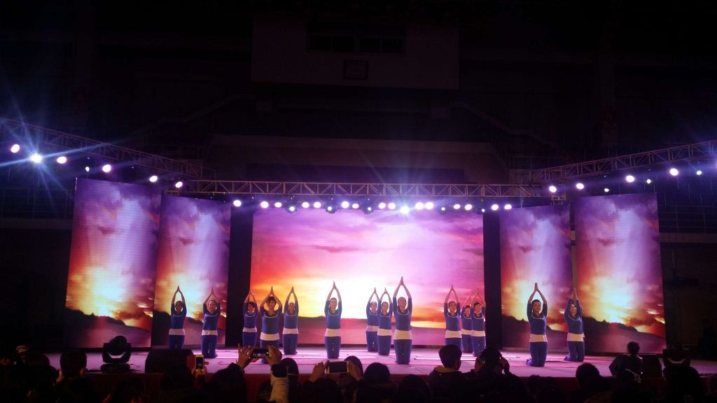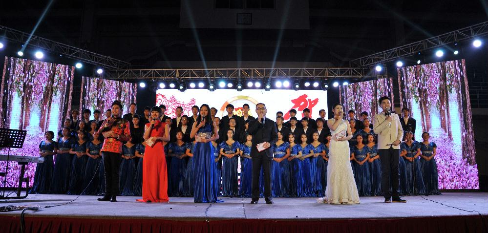 晚会在大学生管乐团的管乐合奏的《玫瑰狂欢节》的庄严而欢快的气氛中拉开了序幕。大学生艺术团合唱队激情高昂地演唱了《鸿雁》与《大爱无疆》,悠扬的歌声、丰富的声部配合带给了师生高雅的听觉享受。