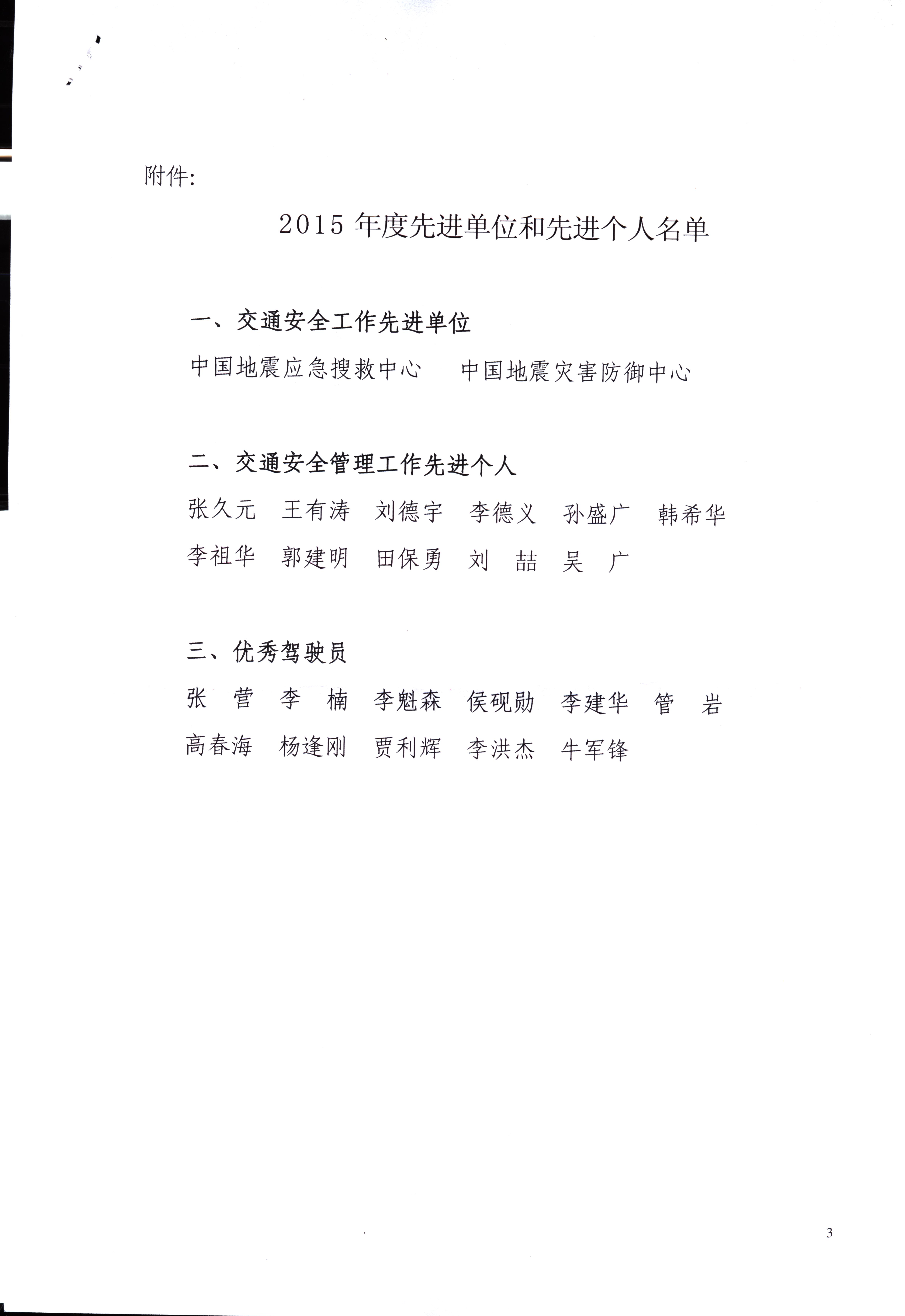 1月15日,中国地震局交通安全委员会召开了2015年度总结大会.会上,我院职工刘喆、吴广被评为“2015年度交通安全管理工作先进个人”。