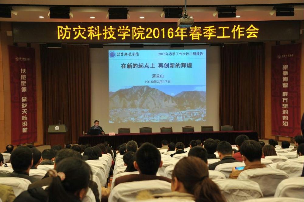 院长薄景山代表学院在会上作了题为“在新的起点上再创新的辉煌”的工作报告。薄院长简要回顾了2015年重点工作、学院“二次创业,分三步走”发展战略,详细解读了“十三五”期间学院建设发展的主要任务,分析了未来五年学院经济状况和2016年学院经费预算,重点部署了2016年学院十项重点工作。薄院长强调,学院未来发展务必做到:坚定执行学院的发展战略;明确未来十年的发展目标;完成未来五年的发展规划;进一步巩固教学中心地位;重点加强优势学科的建设;推进现代大学制度的建设;发扬自强不息的优良传统;构建防灾学院的精神家园;改善办学条件和职工待遇。之后,其他院领导分别作了各自分管领域工作汇报。