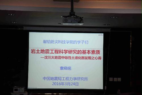 3月24日,中国地震局工程力学研究所袁晓铭研究员应邀来学院做《岩土地震工程科学研究的基本素质—汶川大地震中砾性土液化新发现之心得》的讲座。防灾工程系本科生、研究生和专业教师聆听了讲座。