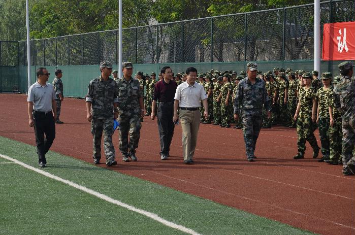 9月21日上午,学院党委书记齐福荣在学院军训工作领导小组副组长、学生工作处处长侯逾昆,办公室主任向勇的陪同下,莅临军训现场视察2015级新生军训工作情况。
