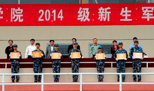 总结大会上,钟南才副院长向中国人民解放军南京炮兵学院廊坊校区赠送了“军民共铸中国梦”的锦旗。党委副书记李军宣读了《关于表彰2014级学生军事训练“先进连队”和“优秀学员”的决定》,在主席台就座的领导和嘉宾为获得荣誉的集体和个人代表颁发了奖状和荣誉证书。军训优秀学员代表灾害信息工程系1450412班耿铭晨同学作了热情洋溢的发言。