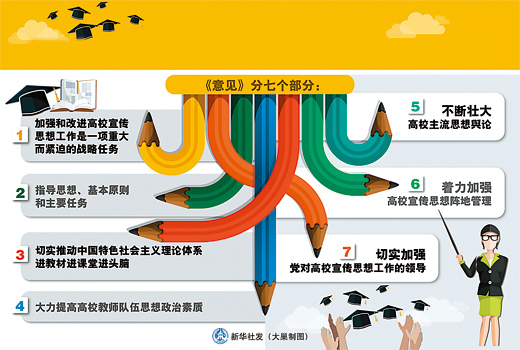 中共中央办公厅、国务院办公厅最近印发《关于进一步加强和改进新形势下高校宣传思想工作的意见》。分为七个部分,包括:加强和改进高校宣传思想工作是一项重大而紧迫的战略任务;指导思想、基本原则和主要任务;切实推动中国特色社会主义理论体系进教材进课堂进头脑;大力提高高校教师队伍思想政治素质;不断壮大高校主流思想舆论;着力加强高校宣传思想阵地管理;切实加强党对高校宣传思想工作的领导。