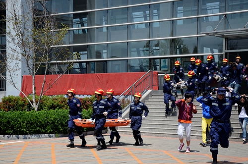 本次演练包括应急避震、应急疏散、现场医疗急救示范演练(包括心肺复苏、止血与包扎)。为了使演练取得良好效果,演练开始前,学院对参加演练的师生进行了培训。11点30分,演练指挥长发出演练指令,疏散演练正式开始。教学楼内正在上课的老师从容不迫地指挥学生按照预定疏散路线有序撤离教学楼并到达指定疏散地点。同时,大学生志愿者地震灾害紧急救援队也利用各种救援工具对“被困”人员进行救援,医疗救护人员对“被救”学生进行紧急施救。