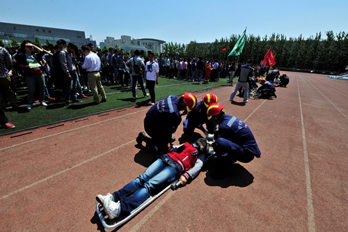 (大学生救援队医疗救护人员对“被救”学生进行紧急施救)