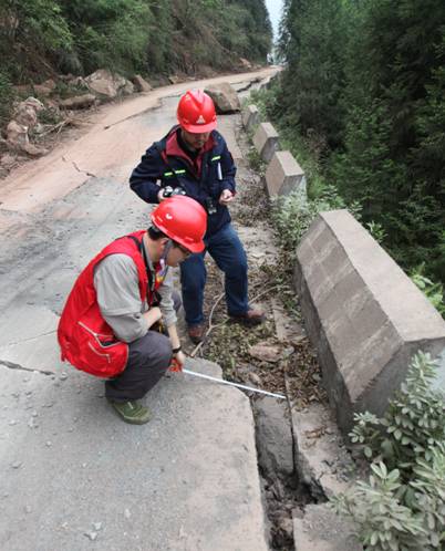 (卢滔和于晓辉在地震现场开展道路变形测量)