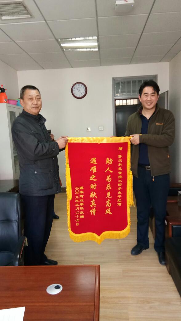 3月26日,潘淑玲老人家属一行四人来到我校经济管理学院,拿出一幅写着“助人为乐见高风,遇难之时献真情”赠语的锦旗,委托交给学院大四学生辛虹雨同学。老人子女激动地说:“我一定要达成母亲的愿望,当面对辛虹雨同学表达感谢。现在很多人遇上这些事情唯恐躲避不及,辛虹雨能在老人危难之时挺身而出,感谢学校培养了这么优秀的学生。”