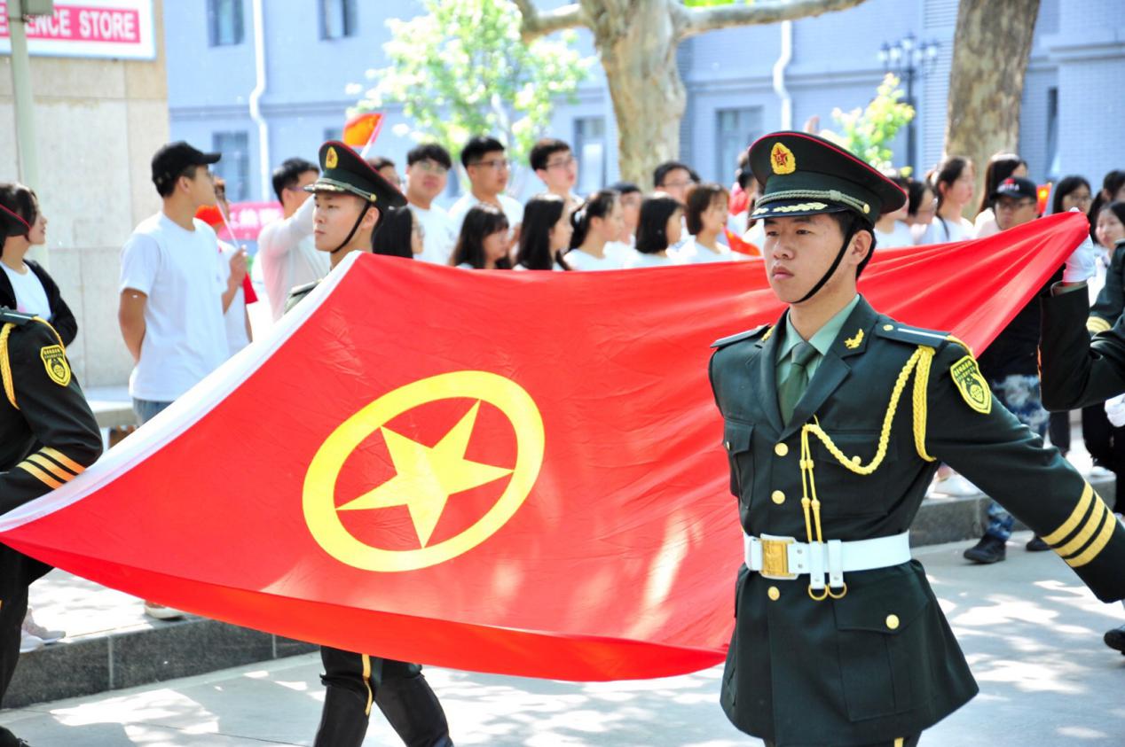 上午9时,校团委书记樊帆在校风石前将国旗交于擎旗手,大学生国旗护卫队护送国旗,沿天水路走向南校操场。沿途中,来自各学生组织、二级学院的同学们手持红旗,一同高唱《歌唱祖国》,宿舍楼、食堂里的学生也纷纷加入,跟随大学生国旗护卫队一同来到南校操场。升旗仪式由三项议程组成,首先由大学生国旗护卫队升旗。随后,学生代表曹澍辰进行国旗下的讲话。最后进行“新青年耀青春,我宣誓你接力”活动,樊帆领誓,在场所有学生共同宣誓。