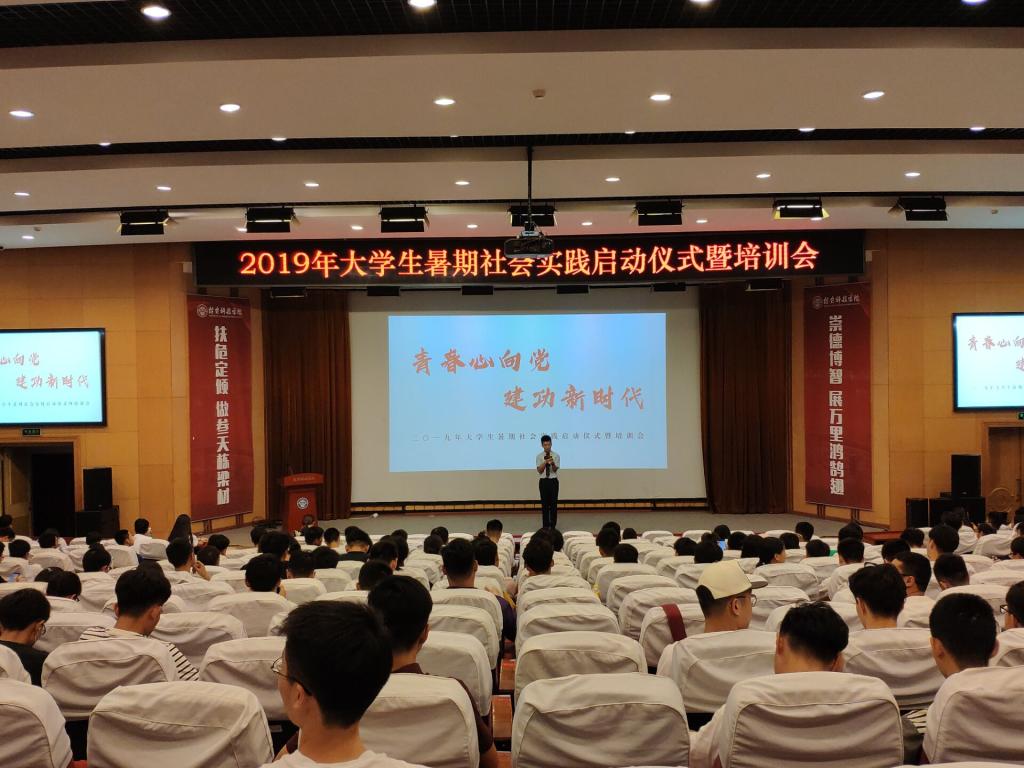 6月15日,2019年大学生暑期社会实践启动仪式暨培训会在图书馆报告厅隆重召开,校团委、团总支实践工作负责人和全体实践团队领队参加会议。会上,校团委书记樊帆为出征队伍授旗并做活动培训,2018年大学生暑期社会实践活动优秀团队代表梁梓絮同学、2019年暑期社会实践活动领队代表朱青华同学分别发言,学校2019年“青春心向党,建功新时代”大学生暑期社会实践活动全面启动。