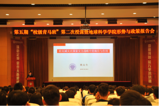 姚运生为同学们做题为“防灾减灾在国家安全战略中的地位与作用”主题报告。