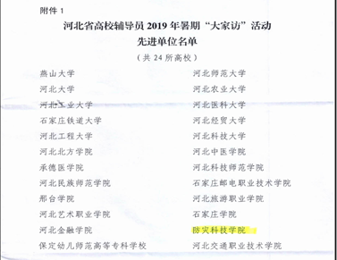 日前,河北省教育厅发布《关于公布河北省高校辅导员2019年暑期“大家访”活动先进单位和先进个人名单的通知》(冀教德育函〔2019〕10号)。我校被评为河北省高校辅导员2019年暑期“大家访”活动先进单位,辅导员陈杰、王媛、塞尔达尔·吾麦尔和内派教师李光明等4位老师被评为河北省高校辅导员2019年暑期“大家访”活动先进个人。