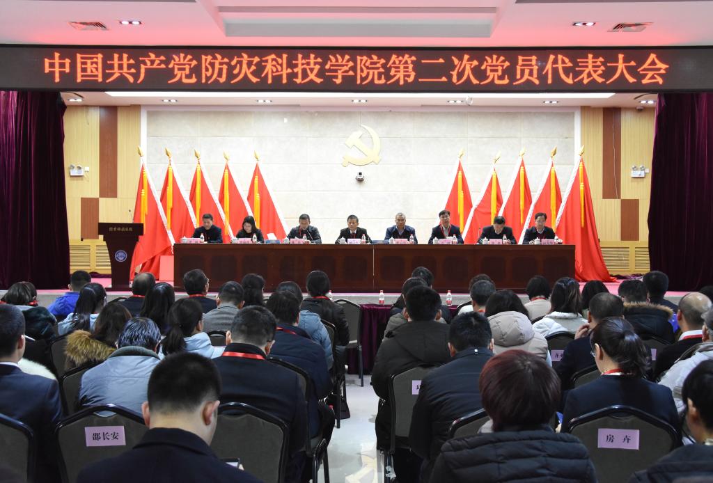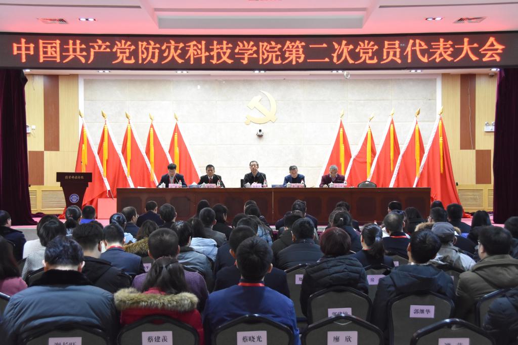 1月9日下午,学校召开中国共产党防灾科技学院第二次党员代表大会。大会的主题是高举中国特色社会主义伟大旗帜,以习近平新时代中国特色社会主义思想为指导,全面贯彻党的教育方针,牢牢把握社会主义办学方向,团结带领全校师生员工不忘初心,砥砺前行,紧紧围绕立德树人根本任务,突出特色,提档升级,为建设现代化的防灾减灾特色大学而努力奋斗!中国地震局党组成员、副局长阴朝民同志、直属机关党委常务副书记李健同志,学校领导班子全体成员、第二次党员代表大会全体党员代表及列席人员参加会议。大会由党委副书记石峰主持。