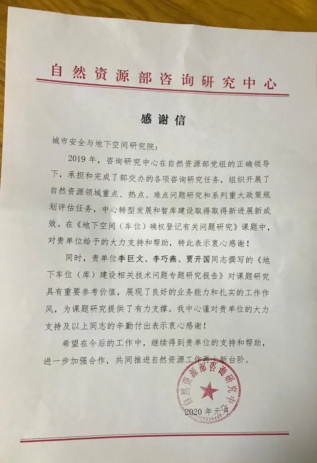 自然资源部咨询研究中心向学校城市安全与地下空间研究院发来感谢信
