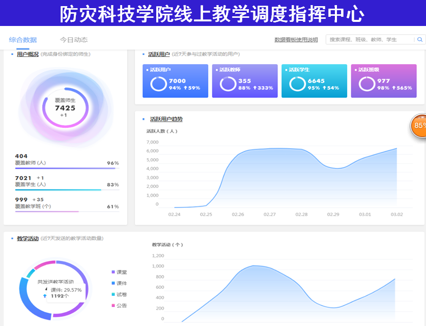 为保证线上教育教学工作顺利开展,学校进行了充分准备,先后多次召开线上部署会议,根据上级部门要求和教学平台运行情况变化不断优化实施方案,先后印发了11个通知,各教学单位根据通知要求精心组织、周密安排,全校师生尽心尽力、通力合作为线上教育打下坚实基础。为保障线上教学顺利进行、万无一失,2月27日、28日,全校师生开展了线上教学“实战模拟测试”,分别对课堂开设情况、教学平台确认使用情况、长江雨课堂平台数据运行状态进行测试与分析,及时与教师和学生沟通,通过建立“线上教学工作联络及技术互助群”、“线上教学管理群”、“防灾科技学院雨课堂服务群”、“防灾超星线上教学服务群”等钉钉、微信工作联络群,确保沟通顺畅和技术服务保障。第一时间发现问题、解决问题,有力保障线上教学工作有一个良好的开端。