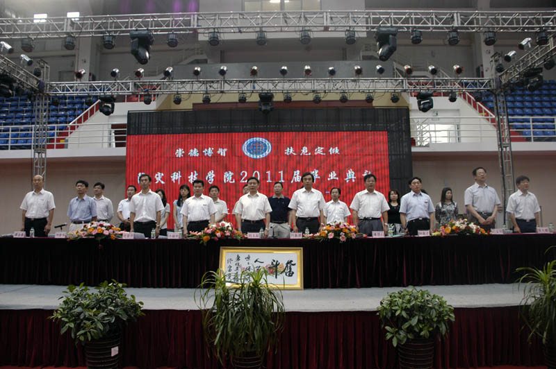 2011年6月24日上午,防灾科技学院在体育馆隆重举行2011届毕业典礼。中国地震局党组成员、副局长刘玉辰、人事教育司司长何振德、人才与教育处处长张大维等与学院领导齐福荣、薄景山、宿景贵、钟南才、迟宝明、刘春平、谭金意等出席了毕业典礼;相关职能部门领导、各系部党政领导、全体辅导员与2011届全体毕业生一起参加了毕业典礼。毕业典礼由学院党委副书记、副院长宿景贵主持。