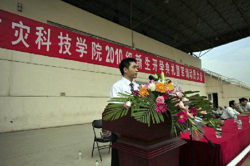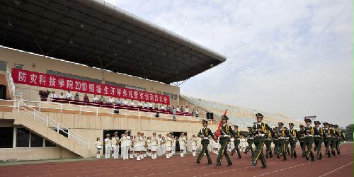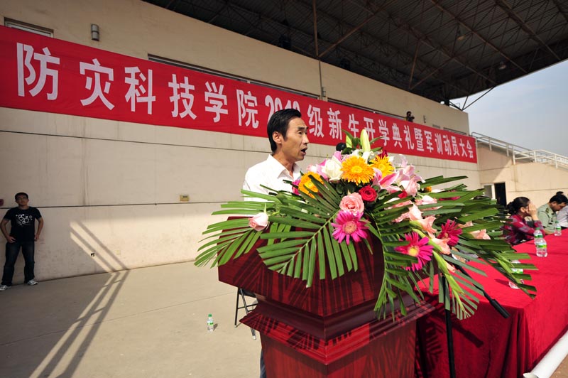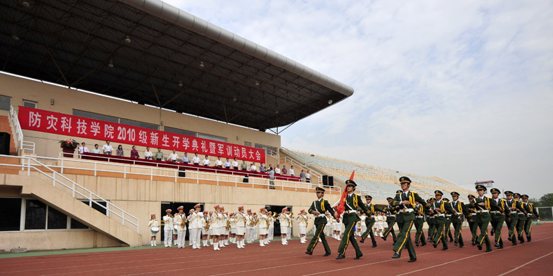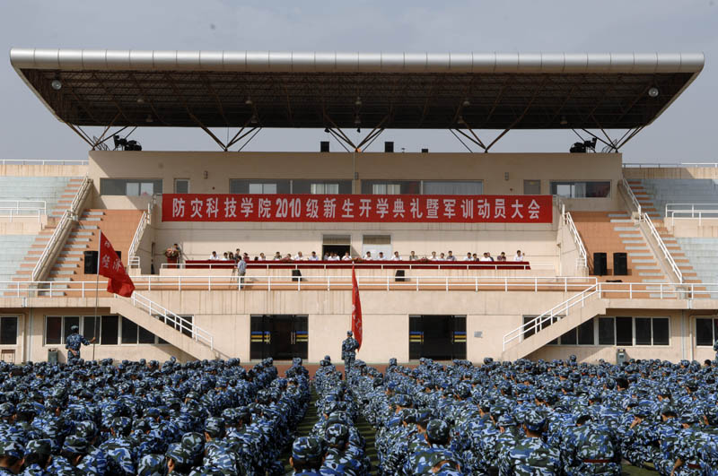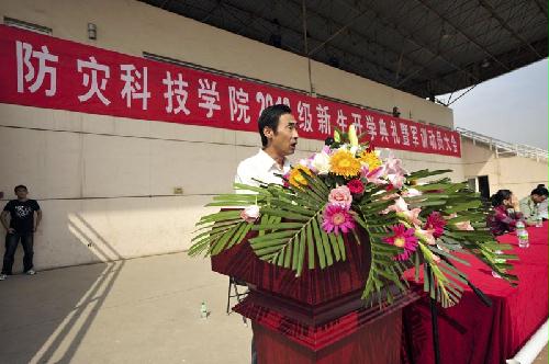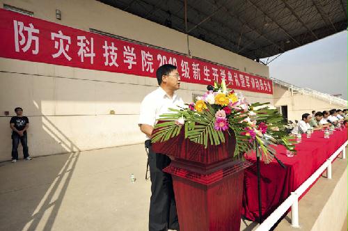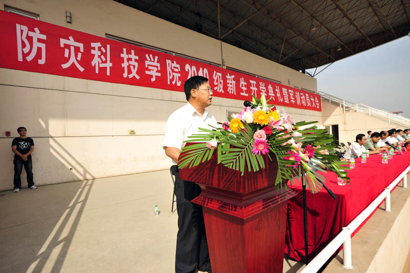 9月8日上午9:00,防灾科技学院2010级新生开学典礼暨军训动员大会在体育场隆重举行。学院领导齐福荣、薄景山、宿景贵、钟南才、刘春平、迟宝明、谭金意,中国人民解放军炮兵指挥学院廊坊校区政治处副主任刘以伟、军训工作办公室主任刘自力出席典礼。学院新生工作领导小组成员、军训工作领导小组成员在主席台就座。全体军训教官、指导员和2010级新生参加了典礼。典礼由学院办公室主任何本华主持。