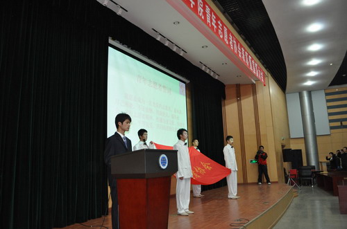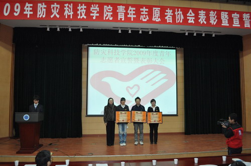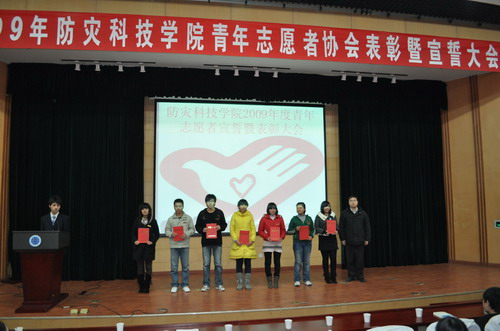 2009年12月5日,院青年志愿者协会在图书馆报告厅举办了2009年度表彰暨宣誓大会。院团委副书记房卉,办公室主任、青年志愿者协会会长赵正阳,各系团总支书记及全院青年志愿者共400多人出席了大会。