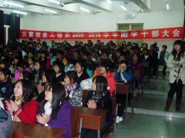 2009年12月20日晚,灾害信息工程系在5J21召开2009—2010学年团学干部大会。系党总支书记田力、辅导员李忠华、唐圣华、姜金征、欧阳群波、王爱玲以及09级新生班部分班主任和辅导员助理出席了会议;系团总支、学生会所有干部及各班班长、团支部书记等主要班干部参加了会议。会议由系团总支副书记周海全主持。
