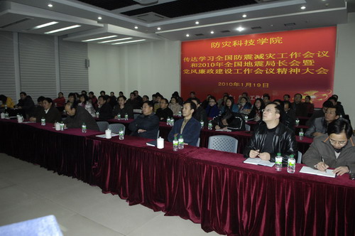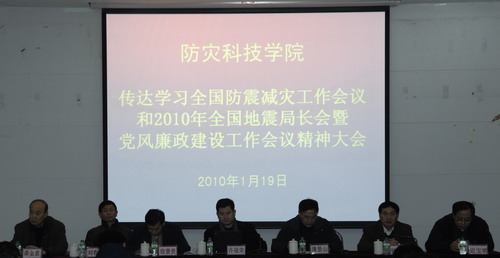 2010年1月19日上午,学院在图书馆一楼多功能厅召开全院科级以上干部大会,传达学习全国防震减灾工作会议和2010年全国地震局长会暨党风廉政建设工作会议精神。学院党政领导班子全体成员出席会议,学院科级以上干部参加了大会。会议由院长薄景山主持。