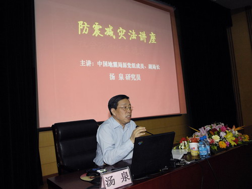 为帮助广大师生进一步深入学习理解《中华人民共和国防震减灾法》(修订),推进依法治校,2009年5月7日,学院特邀请中国地震局原党组成员、副局长、《中华人民共和国防震减灾法》修订工作领导小组顾问汤泉研究员来我院做专题讲座。学院领导、全体教职工和部分学生代表共400多人参加了讲座。
