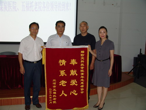 6月15日,三河市煤炭医院、五福托老院张建平院长等一行三人专程来到我院赠送锦旗,以表示对我院青年志愿者协会学生多次慰问托老院老人的感谢,我院党委宣传部副部长贾作璋、团委副书记房卉代表我院接受了锦旗。