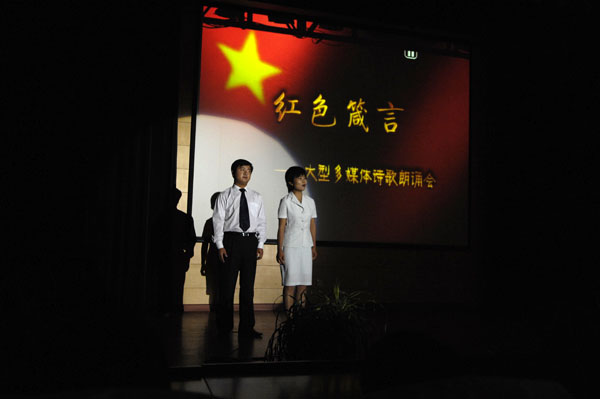 为迎接新中国成立60周年,纪念五四运动九十周年,作为对广大师生开展爱国主义教育活动的一项重要内容,由院党委宣传部、团委共同举办的《红色箴言》大型多媒体诗歌朗诵会,6月11日下午和6月12日晚在图书馆报告厅分两场隆重举行。学院领导齐福荣、宿景贵、钟南才、迟宝明与1000多名师生一起观看了朗诵会。