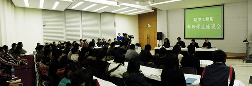 座谈会上,薄景山院长、迟宝明副院长先后为大家详细分析了当前我国各领域人才需求的现状与发展趋势,从自身的求学经历和工作经历出发,为学生们阐述了为什么考研、如何考研、考研应注意什么等重要问题,还特别强调了应加强对大学英语和高等数学的深入学习,同时也对专业课程的学习方法给予了指导。最后,两位院长还耐心详细地解答了考研学生所关心的问题,承诺学院将在适当时间开设考研辅导班,以加强对考研同学的辅导力度;并鼓励大家要立足现实,坚定信心,下苦功夫,大干400天,希望防灾工程系首届本科生在2010年全国硕士研究生招生考试中取得好成绩。