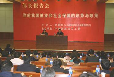为了加深对《政府工作报告》的理解,深刻认识当前我国就业和社会保障的形势和政策,更好地促进科学发展, 4月15日下午,人力资源和社会保障部部长尹蔚民应邀作了《当前我国就业和社会保障的形势与政策》的主题报告。报告以当前我国就业和社会保障的形势与政策为主题,介绍了我国就业和社会保障工作的进展情况及面临的形势任务和对策措施。中央国家机关工委副书记邵旭军主持报告会,中央国家机关各部门400多人参加了报告会。