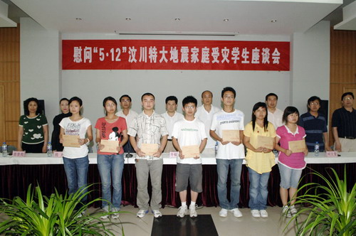座谈会上,全体与会领导、老师、同学首先为汶川大地震遇难同胞默哀一分钟。家庭受灾学生代表分别介绍了家里的受灾情况和自己当前所遇到的困难,对学校的关心表示由衷的感谢。