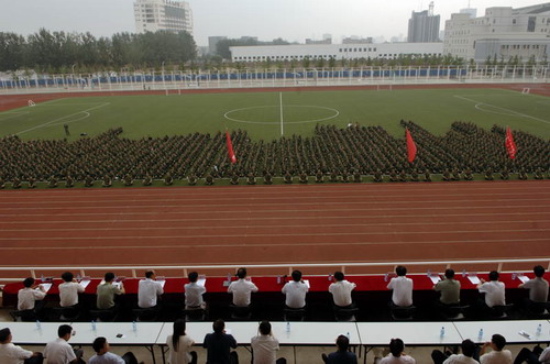 2008年9月17日上午9点,我院2008级新生开学典礼暨军训动员大会在体育场隆重举行。学院领导薄景山、宿景贵、钟南才、刘春平、迟宝明、谭金意,中国人民解放军炮兵指挥学院廊坊分院学兵大队政委韩伯川及学院全体中层干部出席了大会。学院2008级1800多名学子参加了大会,大会由学院党委副书记、副院长宿景贵主持。