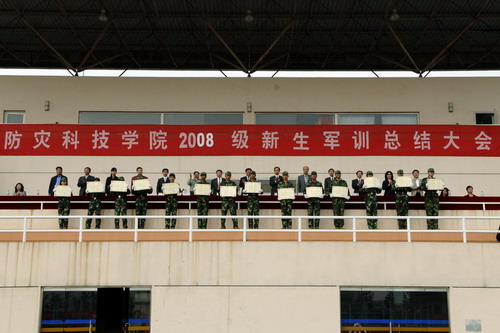 教务处处长、学生军训工作领导小组副组长石峰同志宣读了《关于表彰2008级学生军事技能训练“先进连队”和“优秀学员”的决定》。在主席台就座的领导和嘉宾为获得荣誉的集体和个人分别颁发了奖状和荣誉证书。