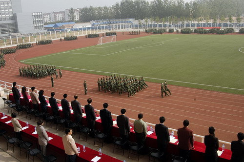 9月28日上午,我院2008级新生军训总结大会在体育场隆重举行,学院领导薄景山、宿景贵、钟南才、谭金意,承训部队首长韩伯川,学院全体中层干部出席了大会,大会由学院学生军训工作领导小组副组长、学生工作处处长侯逾昆主持。