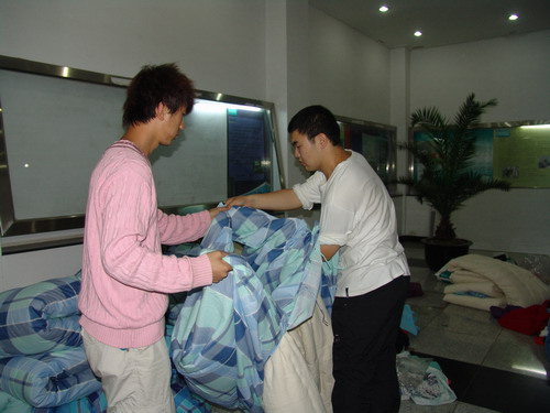 得知这一消息,响应中国地震局转发的中宣部等部门联合发出的有关号召,全院教职工积极行动起来踊跃为汶川地震灾区捐款捐物。尽管只有短短的一天多准备时间,但全院仍捐赠衣被600多套(件)、捐款4000多元。在捐赠活动中,许多场面感人至深。退休的王昕老师今年已79岁高龄,但她不顾劳累,送来了自己亲手缝制的两件衣物;外语系的徐秀丽老师开车拉来了两大包衣物,并自己扛进捐赠现场;几位刚刚为人父母的年轻老师,将一件件婴儿衣物叠得整整齐齐送到捐赠处;大学生服务队的同学们听到活动消息后,将他们自己平时都舍不得用的三条毛毯毫不犹豫地捐赠出来;06201班的凌睿、王睿钰、成改娜等同寝室的六名同学和沙鹏钺、赵传翔同学看到捐赠现场后,立即回寝室临时整理并捐出了18件衣服……