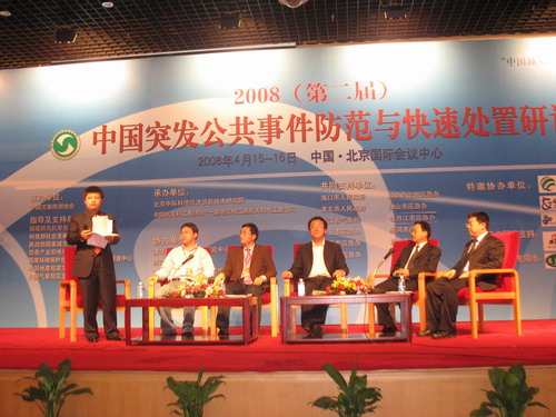 2008年4月15日到16日,由中国灾害防御协会主办、我院协办的“2008中国突发公共事件防范与快速处置”研讨会在北京国际会议中心隆重召开。中国地震局副局长赵和平,国家环保总局环境监察局局长陆新元,国家安全生产应急救援指挥中心副主任李万疆,国家防汛抗旱总指挥部办公室副主任邱瑞田,中国航天科工集团〇六一基地主任曹军,清华大学公共安全研究中心主任范维澄院士,中国交通通信中心副主任殷林,及中国电信等政府、企事业单位的代表出席了开幕式。开幕式由中国灾害防御协会秘书长张辉主持。