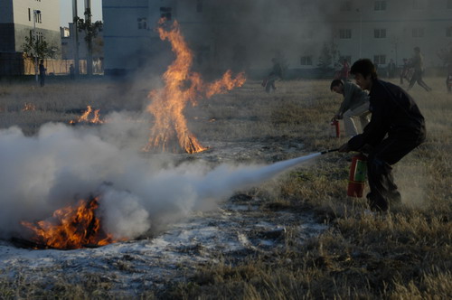 15:30分,九堆大火熊熊燃起,烈焰冲天、浓烟滚滚;130瓶干粉灭火器堆放在距火堆50米的地方;消防演习正式开始。由参加活动的近千名师生员工选出的90名代表分为九队,向大家演示灭火实际操作。院保卫处殷健老师首先讲解了干粉灭火器的使用方法及灭火的注意事项,然后校卫队的两名队员做了示范,最后由各代表队按照“两人一组,每组扑灭一个火点”的要求进行现场演习。参加演习的队员中有头发花白的后勤工作人员,也有柔弱的女图书馆管理员,但他们不甘落后,和20多岁的小伙子们一起往前冲,因为他们工作在消防重点部门,自知肩负着学院防火的一线重任。手提灭火器疾步冲向燃烧的火堆,在距离火堆五米处放下灭火器,拔下安全拴,右手按下压把,左手持喷嘴向火堆扫射,烈火被迅速扑灭。整套动作连贯、利索、一气呵成,赢得了阵阵掌声和喝彩声。