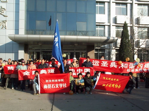 “‘防灾学子,情系奥运’,‘全民奥运,感动中国’,‘为奥运加油 为奥运喝彩’,燕郊环城跑期待您的加入!”