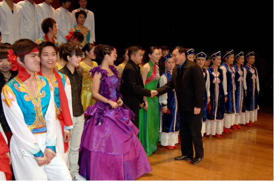中国地震局党组成员、副局长修济刚上台与演职人员亲切握手