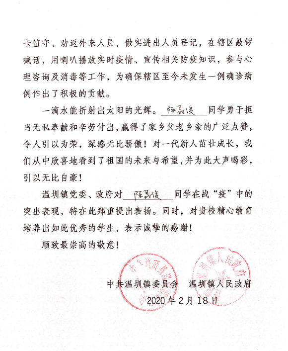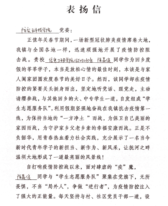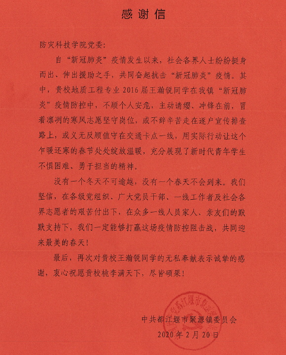 自疫情暴发以来,我校青年学子不但以“防灾人”特有的敏锐、自觉和担当,积极掌握疫情防控知识,严格遵守疫情防控要求,坚决维护疫情防控秩序,而且以各自不同的方式,想方设法为疫情防控做贡献!他们有的挺身而出,迎难而上,第一时间报名当志愿者,坚守在医院、火车站和社区等疫情防控第一线;有的想学校之所想,急学校之所急,慷慨解囊,多方筹措,为学校捐赠疫情防控物资;有的坚决响应学校号召,积极协助辅导员老师,以高度负责精神做好学生疫情防控服务工作……成为疫情防控中“最可爱的人”,受到了当地政府和社会各方面的赞扬。